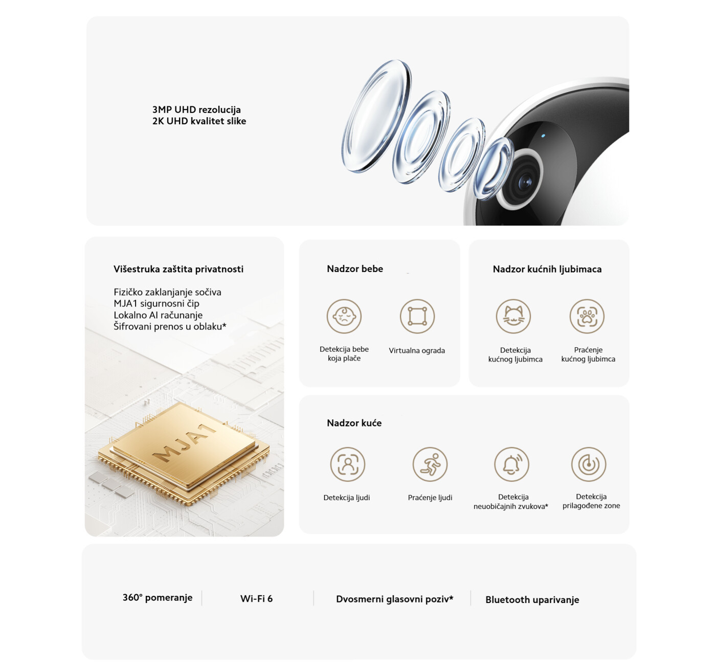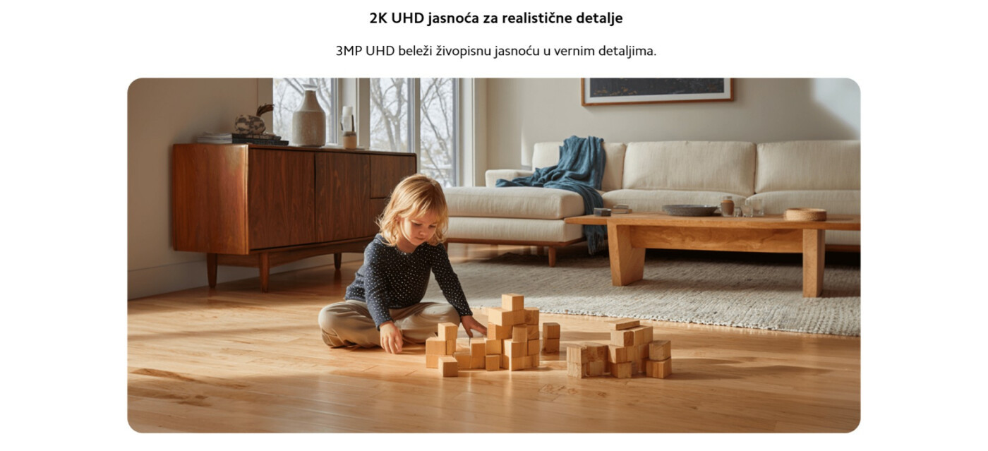Sigurnost i privatnost korisnika su podignuti na najviši nivo upotrebom MJA1 sigurnosnog čipa i inovativne funkcije fizičkog štita objektiva. Kada želite potpunu privatnost, objektiv se može fizički sakriti unutar kućišta kamere, čime se onemogućava bilo kakvo snimanje dok ste u prostoriji. Napredna lokalna AI detekcija omogućava precizno prepoznavanje ljudi, čime se drastično smanjuje broj lažnih alarma uzrokovanih sjenkama ili pokretima zavjesa. Posebno korisna funkcija za roditelje je detekcija dječjeg plača, koja šalje trenutnu obavijest na Vaš pametni telefon čim beba zaplače. Takođe, kamera posjeduje funkciju praćenja kućnih ljubimaca, koja automatski fokusira i prati kretanje Vaših pasa ili mačaka dok niste kod kuće. Uz funkciju virtualne ograde, možete definisati specifična područja unutar prostorije i dobiti alarm čim neko uđe ili izađe iz tog polja. Dvosmjerna glasovna komunikacija sa ugrađenim zvučnikom velikog promjera omogućava Vam da jasno razgovarate sa ukućanima, pružajući Vam osjećaj prisutnosti čak i kada ste kilometrima daleko od svog doma. Algoritmi vještačke inteligencije konstantno uče i prilagođavaju se Vašem prostoru, što znači da će s vremenom kamera postati još preciznija u razlikovanju bitnih događaja od pozadinske buke. Integrisani sistem za detekciju abnormalnog zvuka poput loma stakla dodatno pojačava zaštitu imovine, šaljući upozorenje prije nego što uljez uopšte uđe u vidno polje.