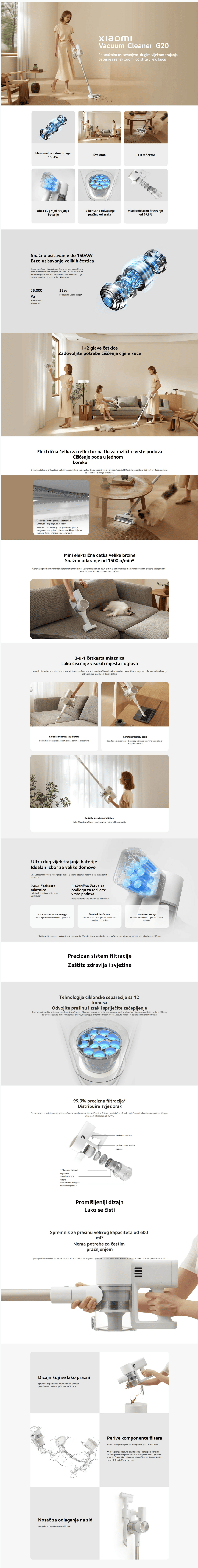 Snaga od 150AW efikasno uklanja prašinu, dlake i mrvice sa različitih podloga